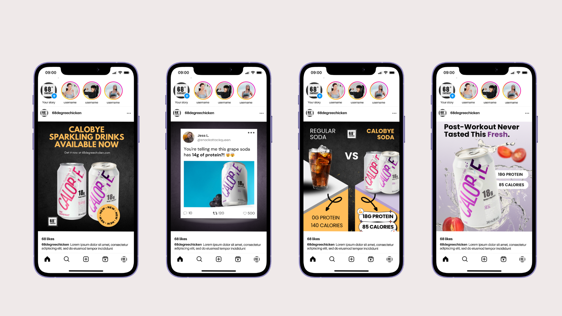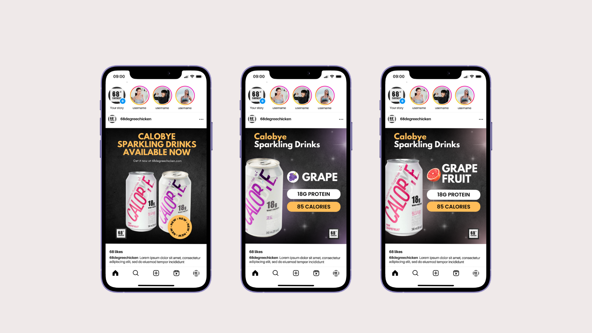 A social media campaign designed to launch Calobye Sparkling Protein Drinks through a series of teaser, reveal, and product-focused visuals. The campaign builds anticipation before the launch and highlights the drink’s key benefits: high protein and low calories, positioning it as a healthier alternative to regular soda.