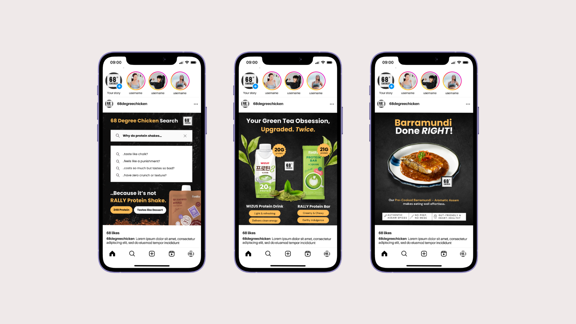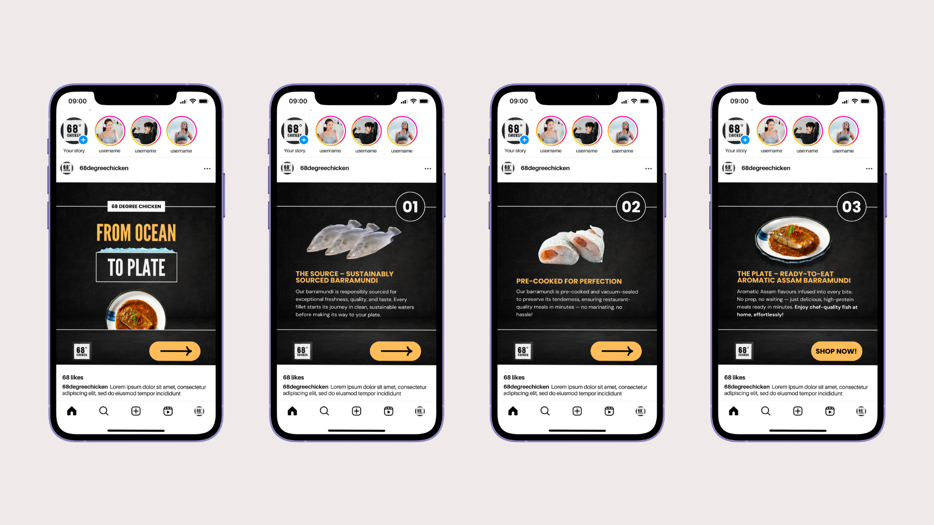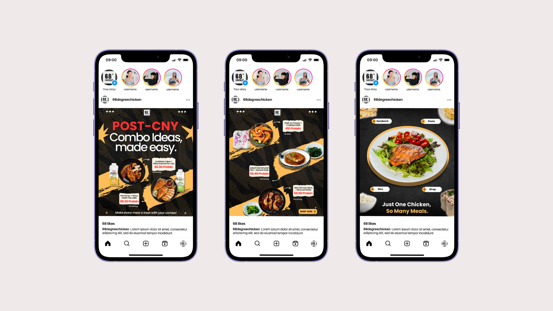 A social media content series designed to promote 68 Degree Chicken through a balanced mix of flavour-focused, product-led, and lifestyle-driven posts. The content highlights the brand’s unique inner fillet cut, showcases the different flavours, and educates audiences on the nutritional benefits of high-protein meals. Complemented by motivational fitness messages and simple meal inspiration, the posts position 68 Degree Chicken as a convenient, healthy protein choice for busy individuals and fitness-focused consumers.