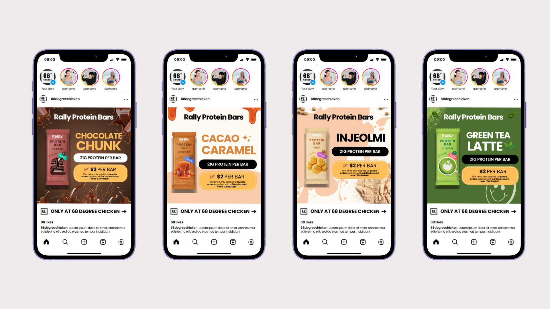 A series of promotional visuals were created for the Rally Protein Bars, featuring four flavours: Chocolate Chunk, Cacao Caramel, Injeolmi, and Green Tea Latte. Each visual was designed with flavour-specific colours, textures, and ingredients to help viewers easily imagine the taste and character of each bar.